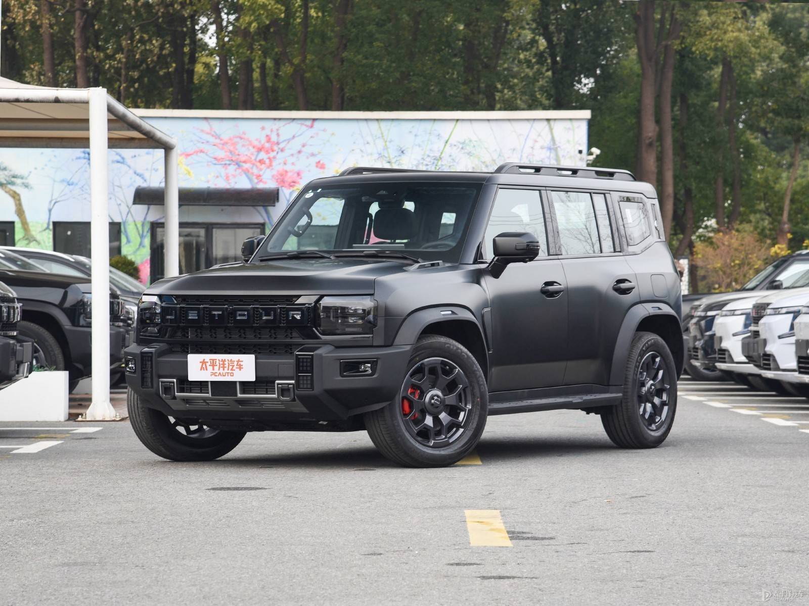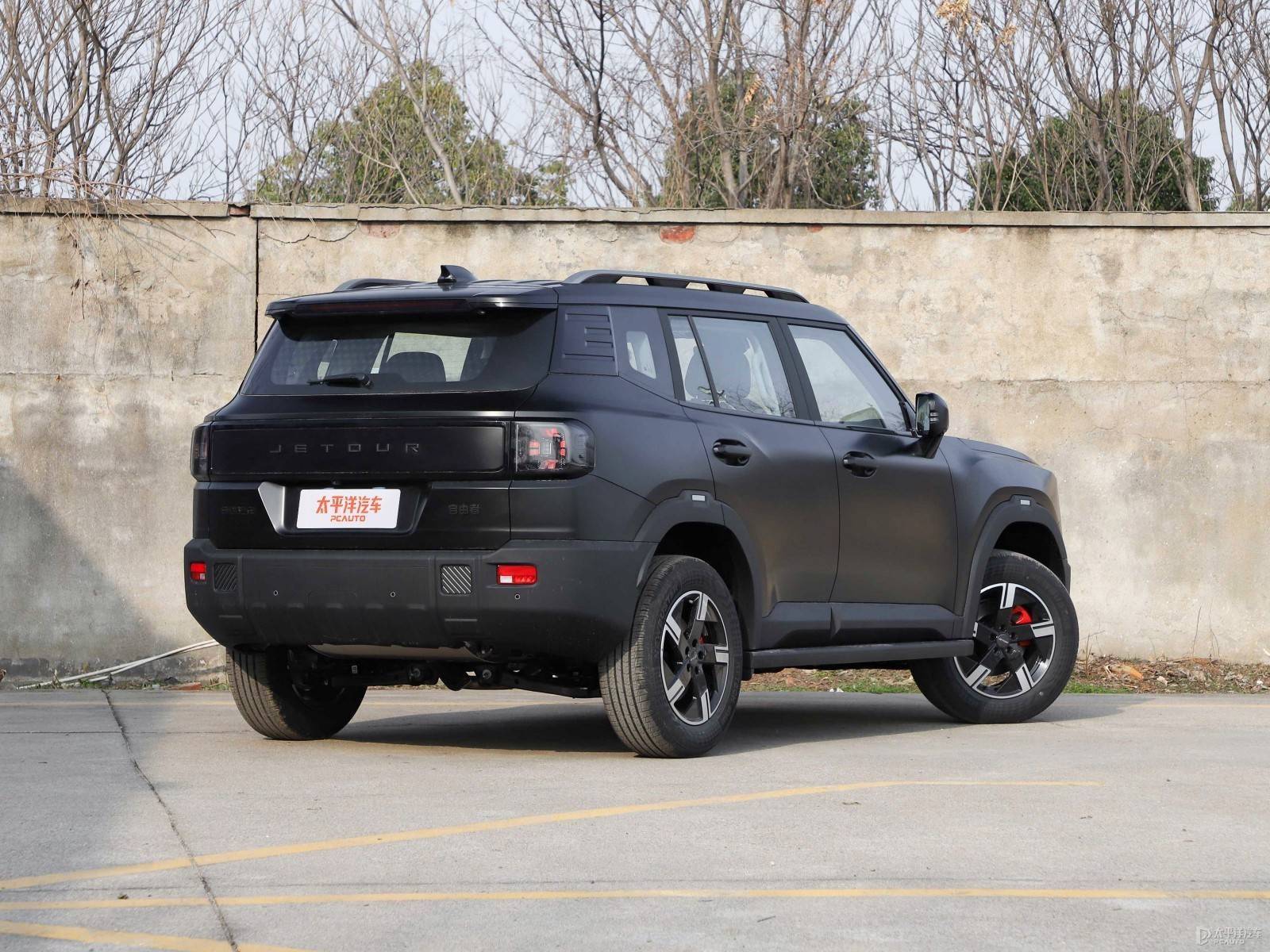 自由者这边在现款方盒子造型的基础上,同时拥有长方形熏进气格栅+表面“JETOUR”英文LOGO、四叶草造型前大灯组。同样整车都是“黑化”外观风格,配备黑色车顶行李架、黑色轮眉和黑色车窗装饰条。
