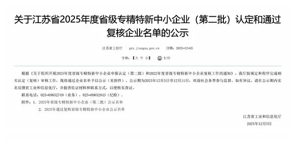 近日,江苏省工信厅公布了《关于江苏省2025年度省级专精特新中小企业(第二批)认定和通过复核企业名单的公示》,江阴法尔胜(000890)泓昇不锈钢制品有限公司和江苏法尔胜光电科技有限公司凭借卓越的专业能力与创新实力成功通过复核,这是对公司过去数年“专精特新”发展路径的权威肯定,也标志着综合实力与行业地位得到了持续认可。